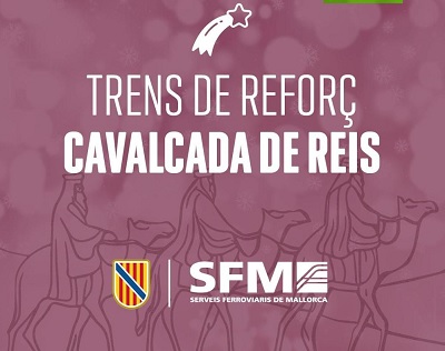 SFM refuerza el servicio de tren Palma–Inca con motivo de la Cabalgata de Reyes. La medida se enmarca en el dispositivo especial de refuerzo de servicios ferroviarios activado durante las fiestas de Navidad. Servicios Ferroviarios de Mallorca (SFM) reforzará el servicio de tren Palma–Inca este próximo lunes día 5 de enero con motivo de la celebración de la Cabalgata de Reyes en Palma. Este refuerzo se suma a los servicios especiales habilitados desde finales de noviembre, antes y durante las fiestas navideñas y de madrugada durante la Nochebuena y la Nochevieja.